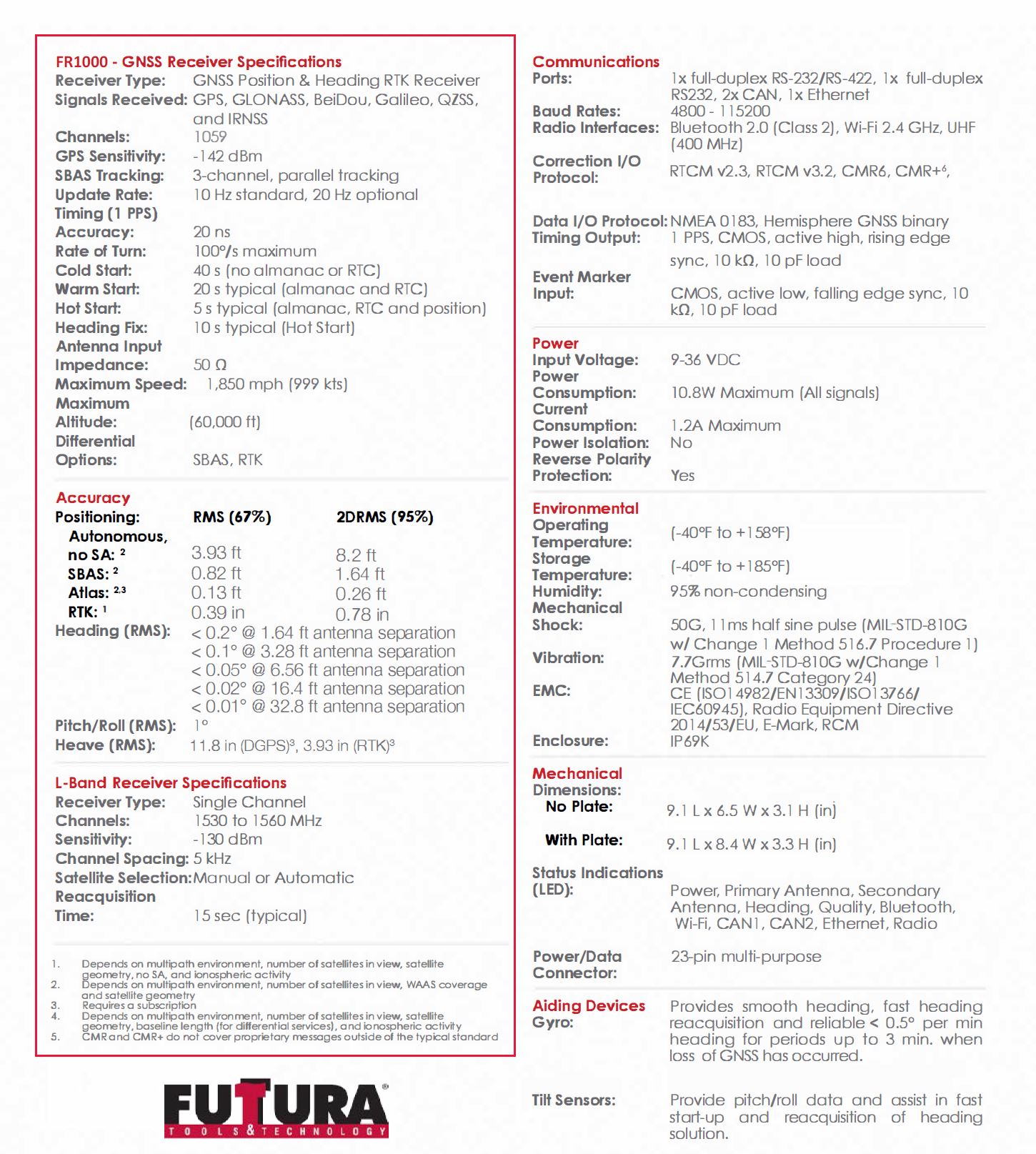 The FR1000 is Futtura’s premiere multiGNSS, multi-frequency position and heading receiver designed specifically for the machine control market. Providing precise heading, Athena RTK positioning, and its rugged design is compliant to IP69K, MILSTD- 810G, and IEC 60068-2 standards. The FR 1000 supports antenna separations up to 10 meters, offering heading accuracy to 0.01 degrees RMS in addition to RTK position accuracy.